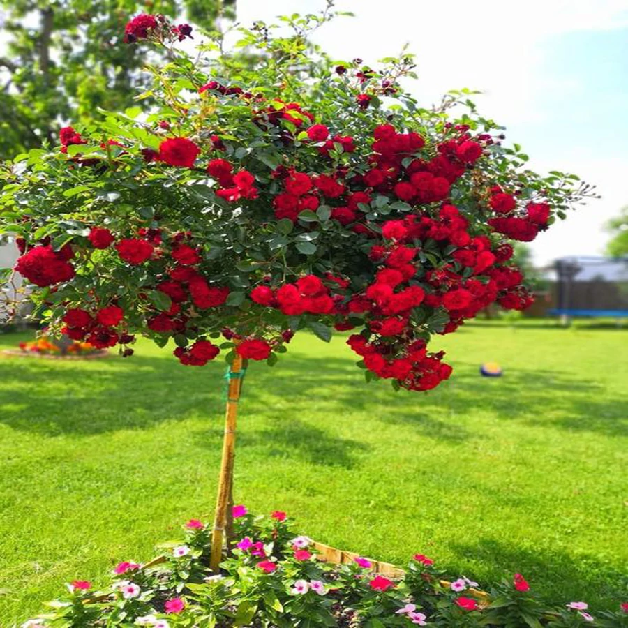 A Bordó csüngő rózsa egy különleges, magastörzsű dísznövény. Ágai lágyan lefelé ívelnek, mintha virágfüggönyként borulnának a törzsre. Elegáns, romantikus hangulatot teremt a teraszon vagy a bejáratnál.